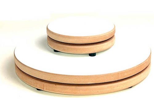 Een boetseerschijf van MDF met een doorsnee van 25 cm. Het geboetseerde werkstuk kan al ronddraaiend van alle kanten bewerkt en bekeken worden.