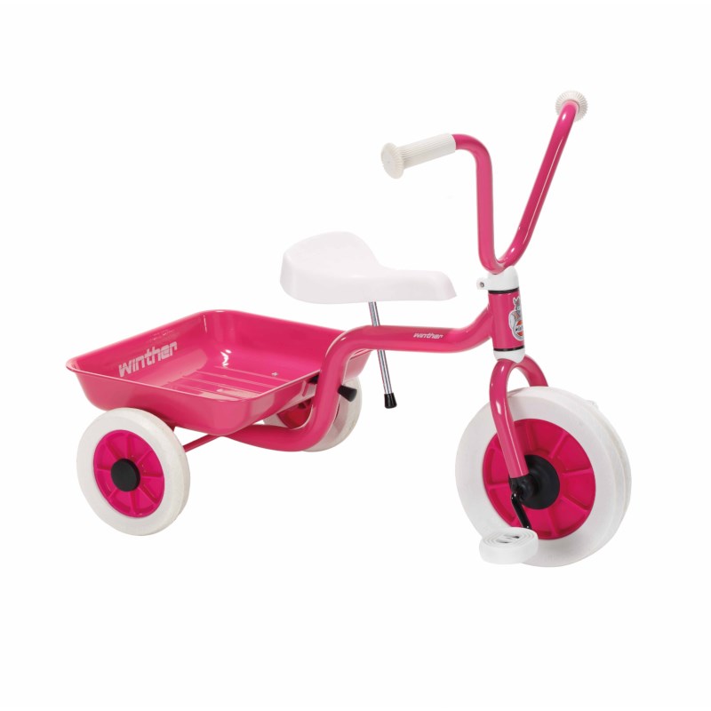 Roze stevige Winther driewieler, voorzien van kiep- en laadbakje, verstelbaar zadel en volrubber banden.