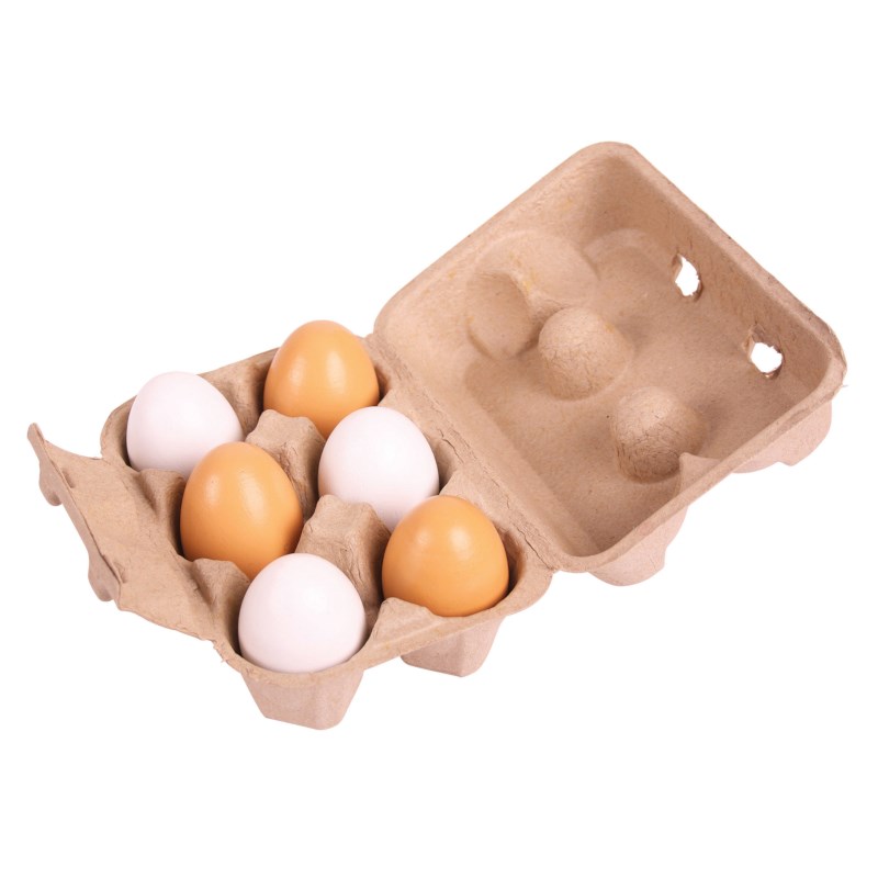 Een eierdoos met 6 eieren. De eitjes zijn niet van echt te onderscheiden, dus uitermate geschikt in de speelgoedkeuken. Bevordert het sorteren.
