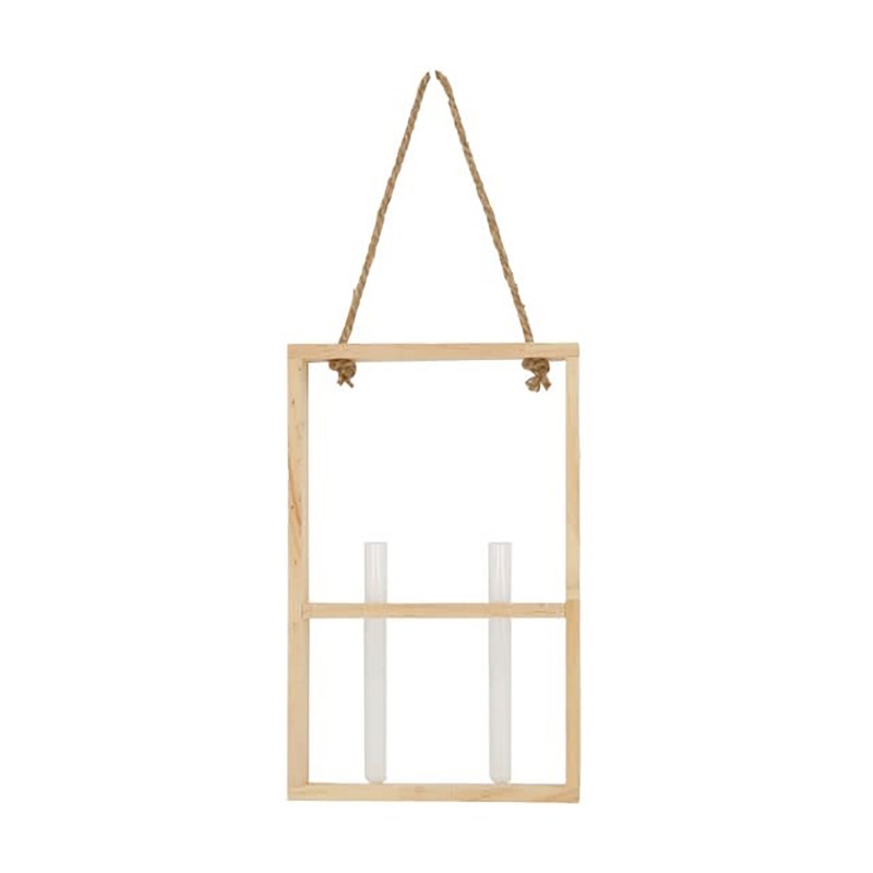Houten rekje met daarin 2 staande reageerbuisjes. Het houten frame heeft een lus zodat het frame opgehangen kan worden.