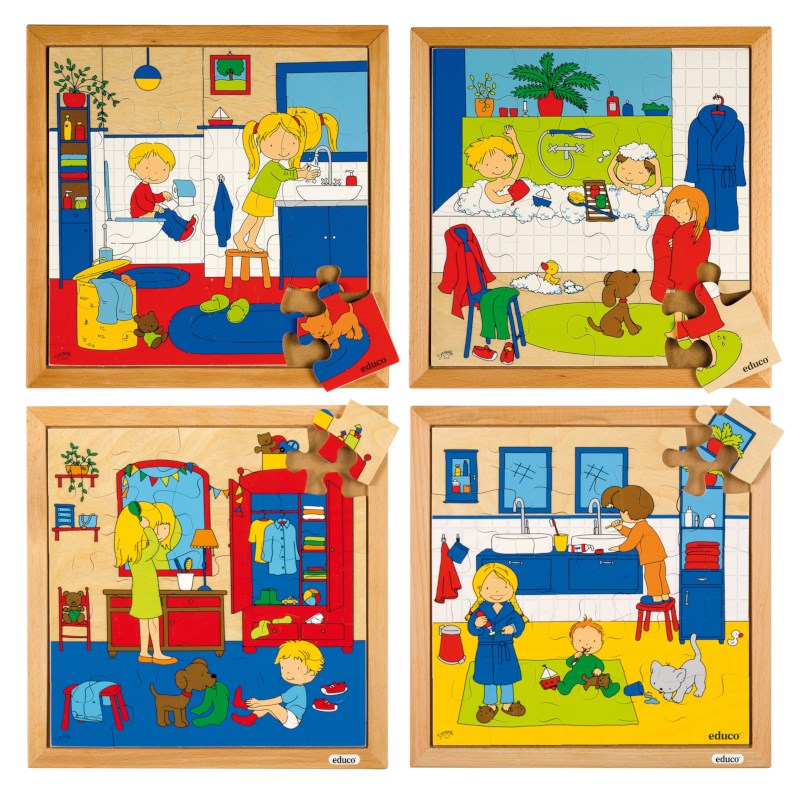 Complete set van vier puzzels over persoonlijke hygiëne, van tandenpoetsen tot aankleden.