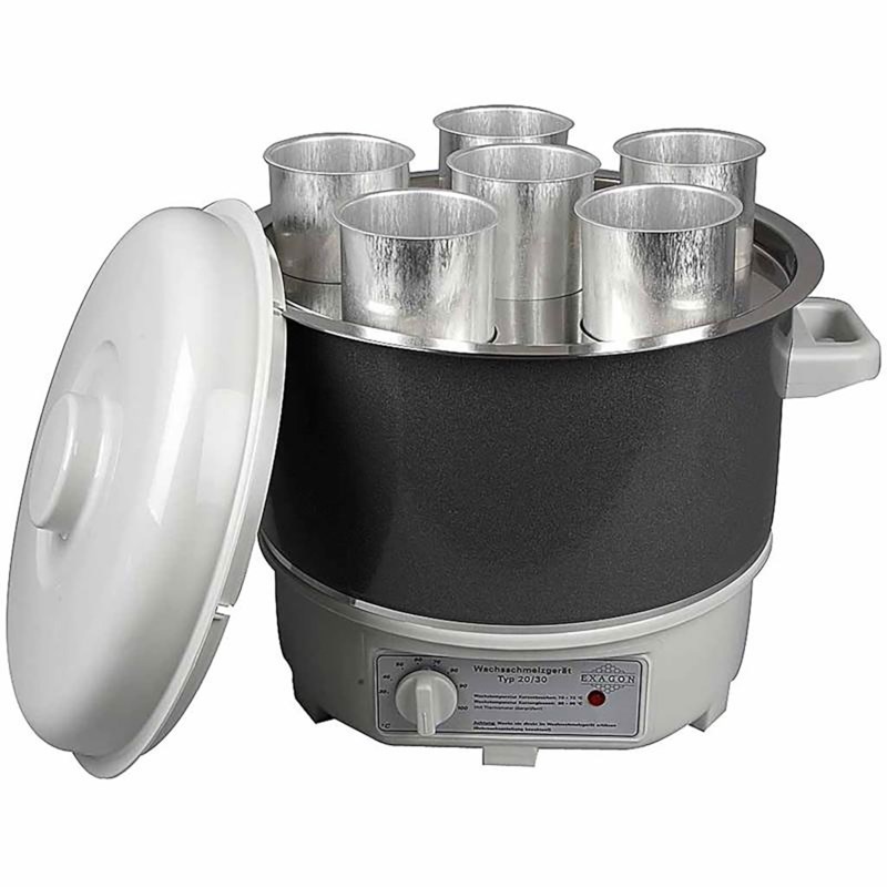 Grote ketel voor het smelten van was. De pan heeft 6 smeltpannen en een handvat en wordt gebruikt om zelf kaarsen te maken.