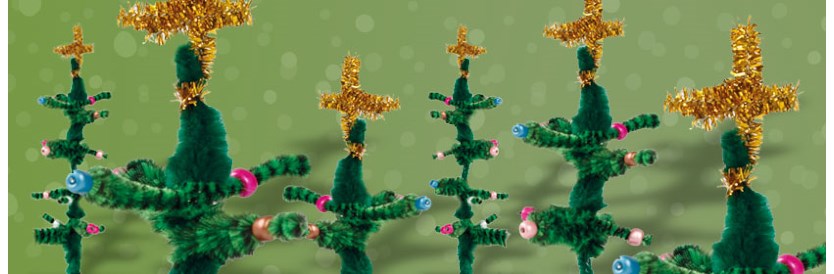 De kerstboom draait je kind heel eenvoudig in elkaar met groen (de takken) en bruin (het kruis) en goudkleurig chenilledraad. Door kraaltjes om te takken schuiven - een precisiewerkje voor kleine vingertjes! - krijgt de boom mooie kerstballen.