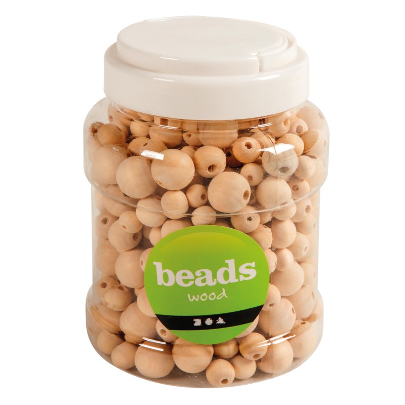 Houten, ronde kralen in diverse groottes in natuurlijke kleuren. Doorsnede: 8, 10, 12 en 15 mm. Gatgrootte: 2-3 mm. 175 gram.