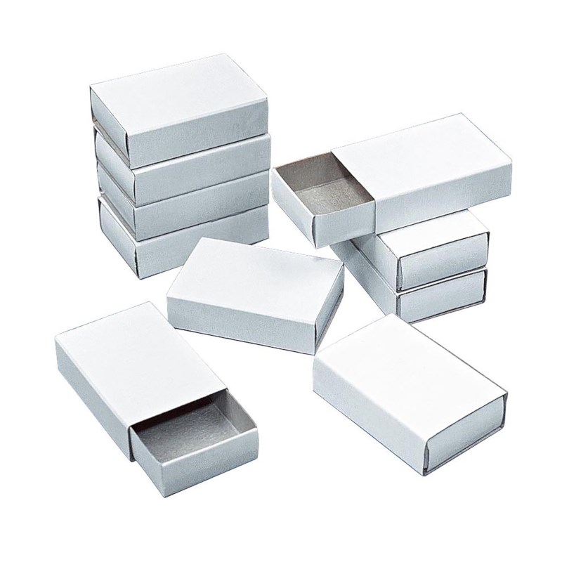 Wit kartonnen lucifersdoosjes.