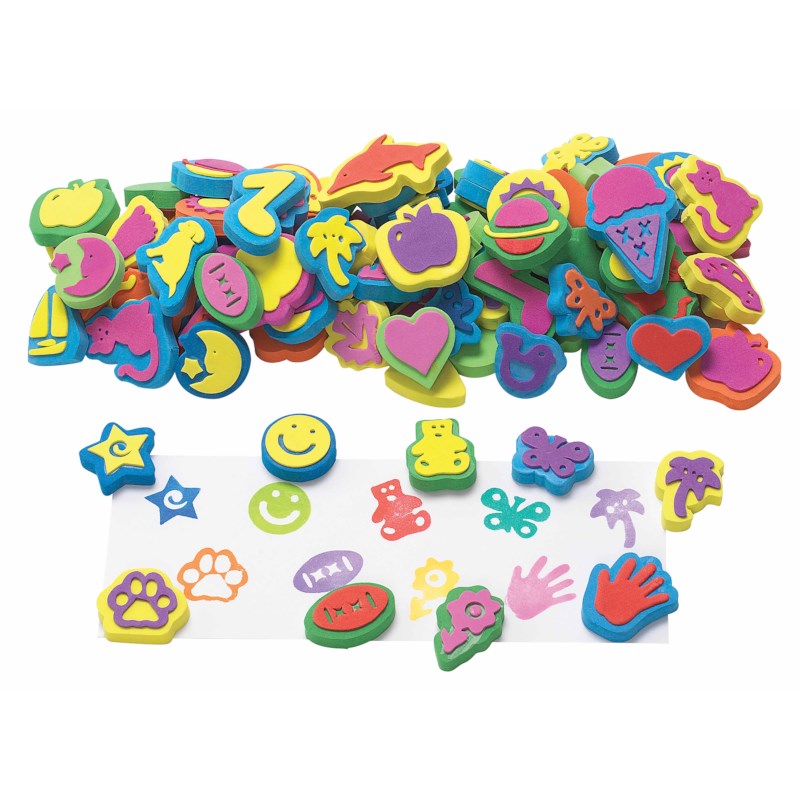 - 25 afbeeldingen: appel, beer, vogel, vlinder, kat, auto, dolfijn, libel, hond, bloem, voetbal, voet, hart, blij gezicht, ijsje, blad, maan, muzieknoot, planeet, palmboom, pootafdruk, zeilboot, ster en zon, samen 80 stempels