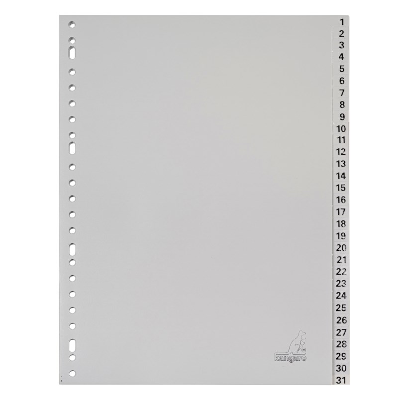 Grijze kunststof tabbladen A4 formaat - 23 gaats. Tabs zijn eenzijdig zwartbedrukt met de cijfer 1-31.
