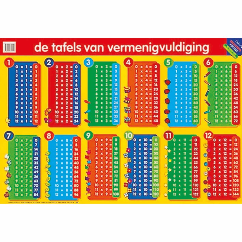 Deze gelamineerde educatieve poster bevat de tafels van vermenigvuldiging. De tafels 1 t/m 12 zijn op deze poster opgenomen.