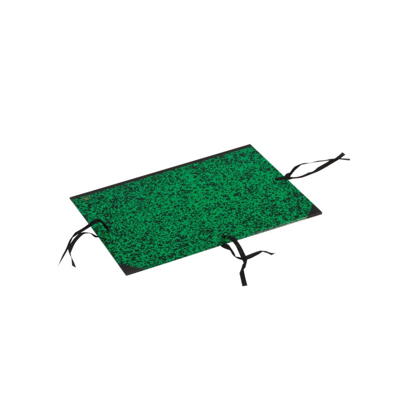 Sterke groen gemarmerd kartonnen tekenmap. Rug en hoeken verstevigd met linnenband en lintsluiting. Afmeting 37 x 52 cm en een capaciteit van 3 cm.