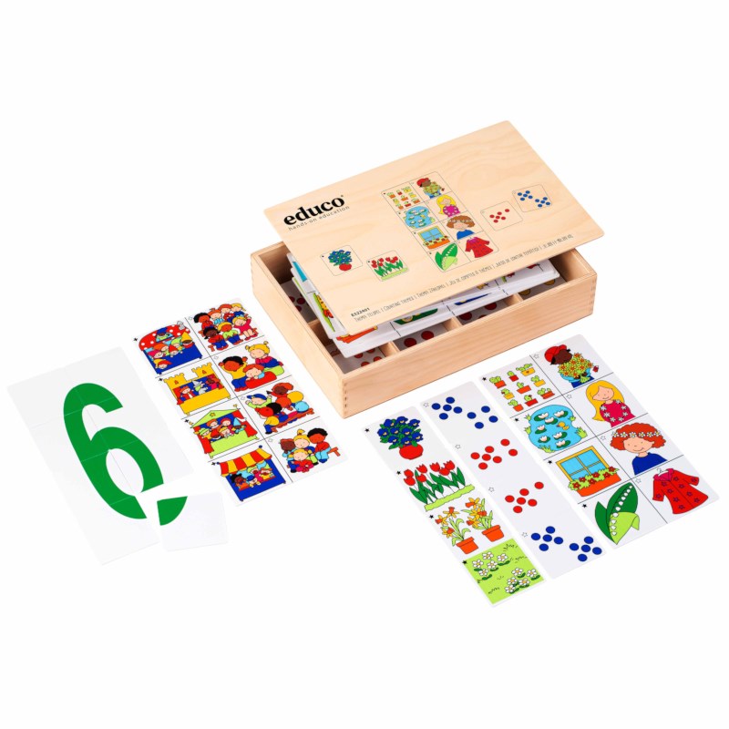 Thematelspel combineert tellen en ordenen. Kinderen kiezen een opdrachtkaart en zoeken de juiste beeldkaarten met dezelfde