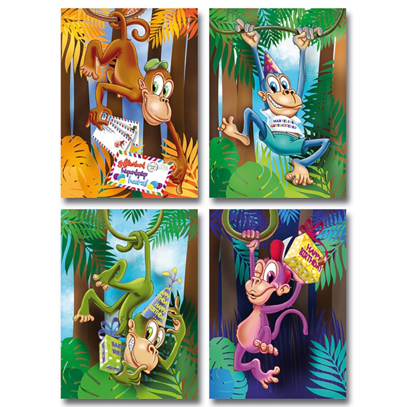 Ansichtkaarten met afbeeldingen van getekende apen - Happy Birthday.