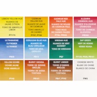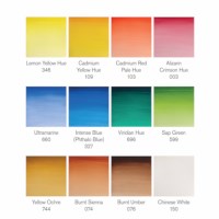 U krijgt geleverd: pocketbox met 12 halve napjes in de kleuren lemon, yellow, cadmium redpale hue, crimson alizarin, ultramarine, intense blue, emerald green, sap green, yellow ochte, burnt sienna, burnt umber en china white.