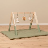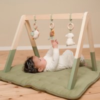 Ontdekken, spelen en verwonderen over de leuke boerderijhangers aan de babygym. Aan de gym hangen een kip, zonnebloem en schaap, die de baby kan vastpakken en ontdekken.