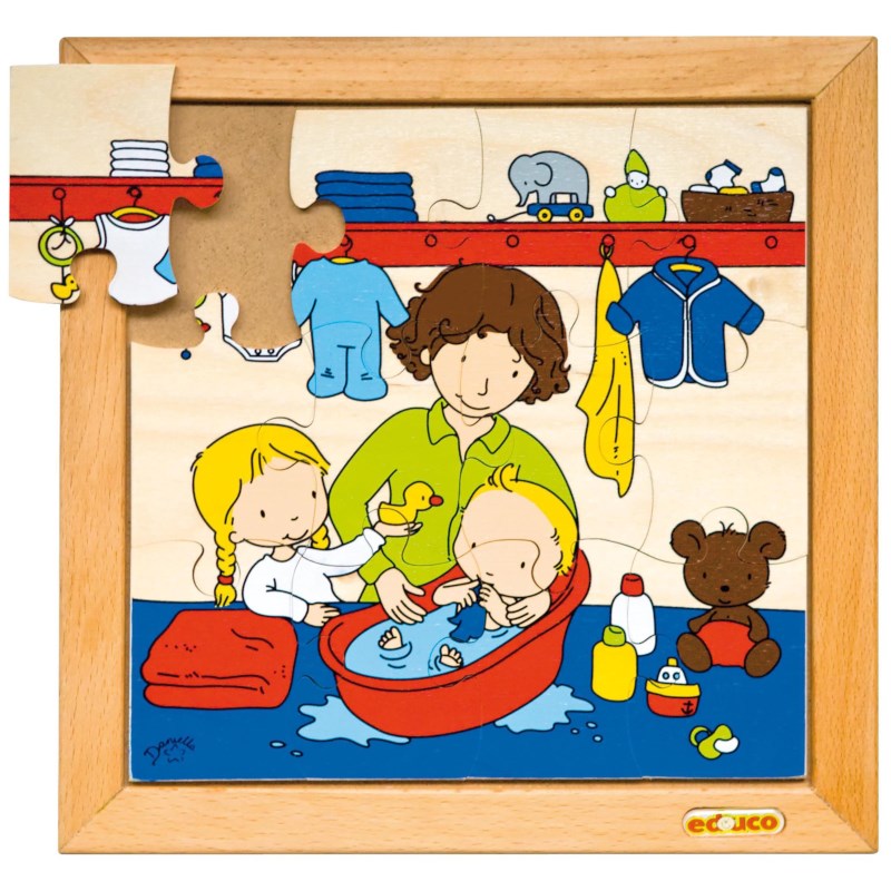 Baby - in bad is een legpuzzel waarin verzorging en geborgenheid samenkomen. Kinderen zien een baby in een badje, omringd door een ouder en speelse elementen zoals badspeeltjes en een zachte handdoek. Ze ontdekken hoe een baby wordt gewassen, ingesopt en afgedroogd.