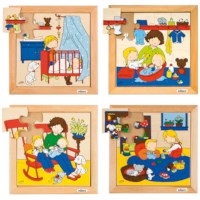 Complete set van vier puzzels over het dagelijks leven van een baby, van slapen tot spelen.