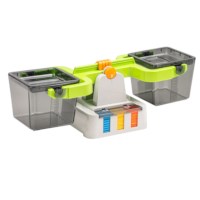 Weegschaal met maatbekers en gewichtenset voor het onderzoeken van massa en verhoudingen.