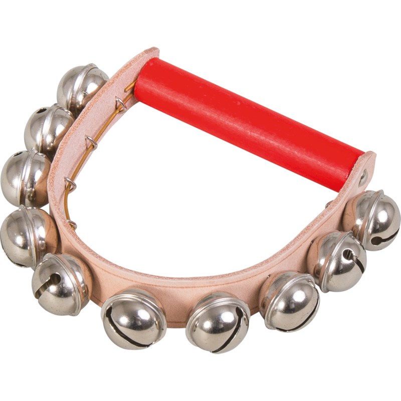 Bellenkrans Orff met 10 belletjes aan een leren band met houten handvat.