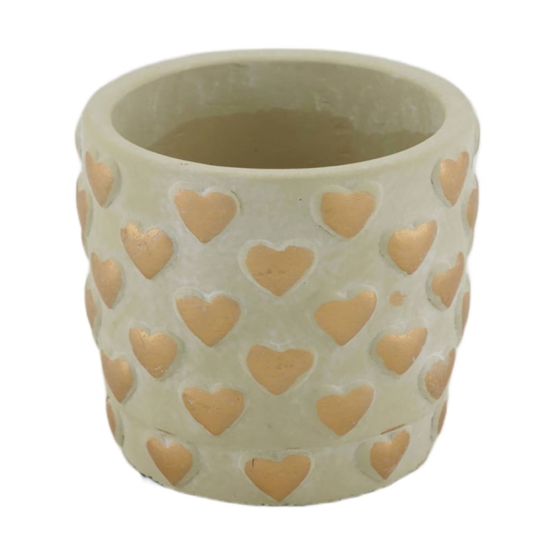 Leuke zandkleur terracotta bloempotjes met opliggende hartjes in een goudtint.