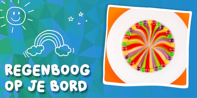 Water kan verschillende kleuren hebben. Zo is melk wit en cola zwart. Maar wist je dat je water zelf ook kleurtjes kan geven? In dit experiment gaan we een bord met water alle kleuren van de regenboog geven.