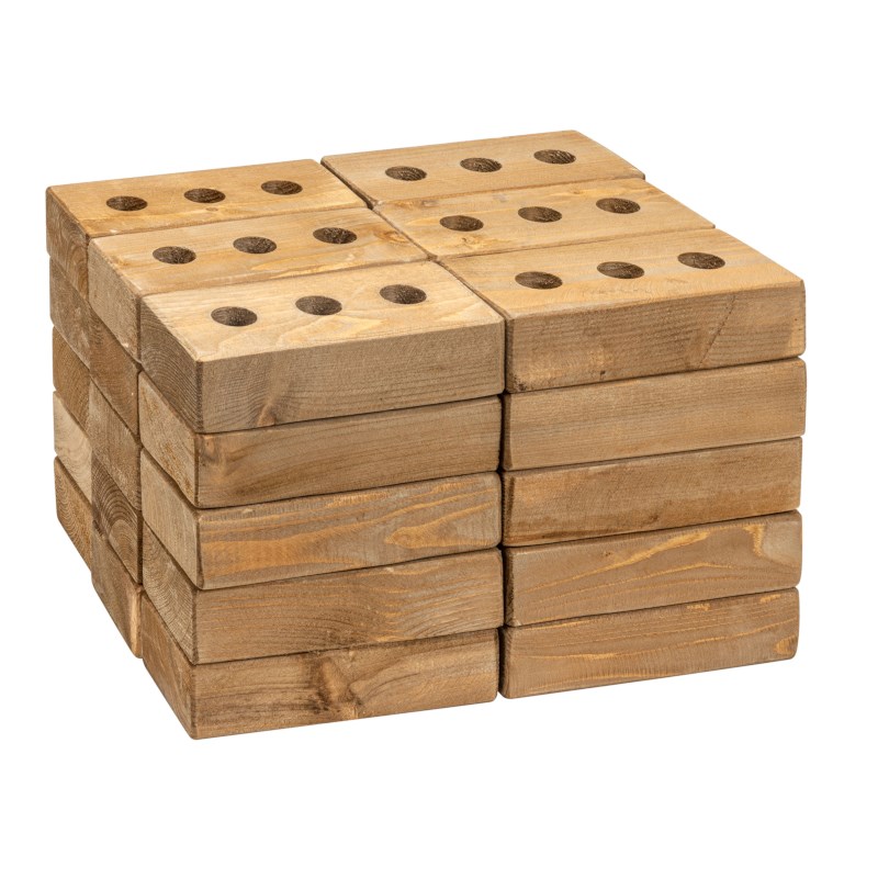 Bouw een stabiele constructie met deze houten blokken die licht van gewicht zijn. Dankzij de gaten in de blokken kan de constructie worden verstevigd met bezemstelen. De hoeken van de blokken zijn licht afgerond. We adviseren de blokken te behandelen met lijnzaadolie zodat ze mooier blijven bij gebruik in weer en wind.