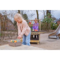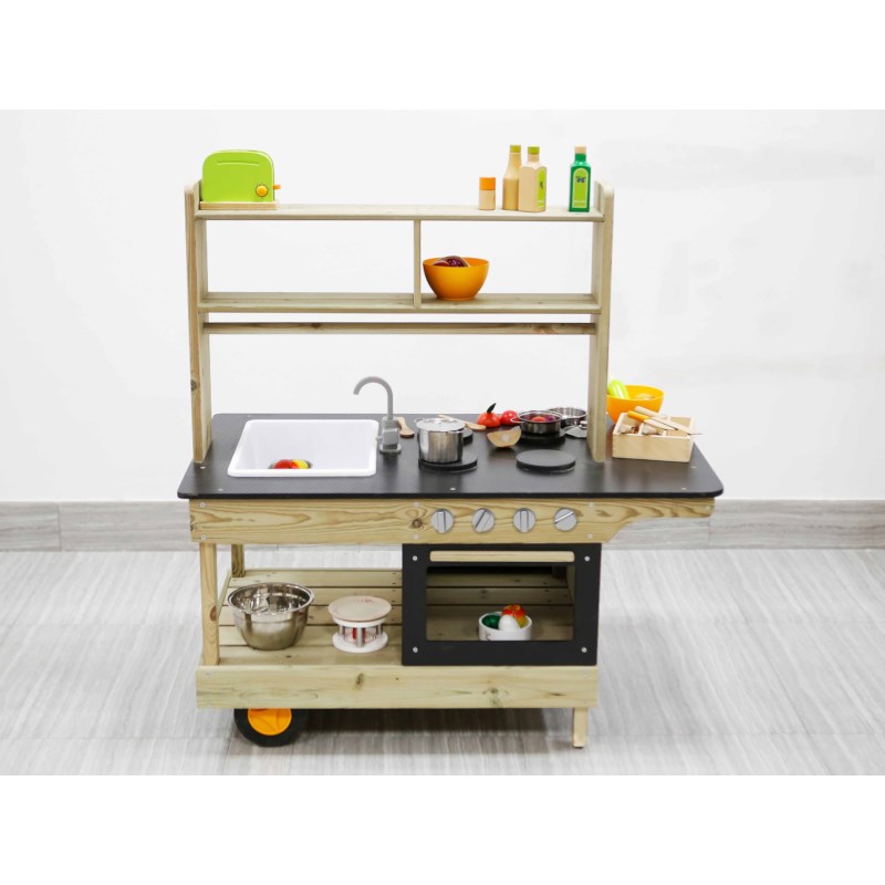 De buitenkeuken is gemaakt van hoge kwaliteit hout en is bestand tegen diverse weersomstandigheden, hierdoor kan hij ook buiten blijven staan. Door de stevige constructie met wielen is hij makkelijk te verplaatsen, maar staat hij ook zeer stevig. Hierdoor is hij makkelijk en veilig te gebruiken door kinderen.