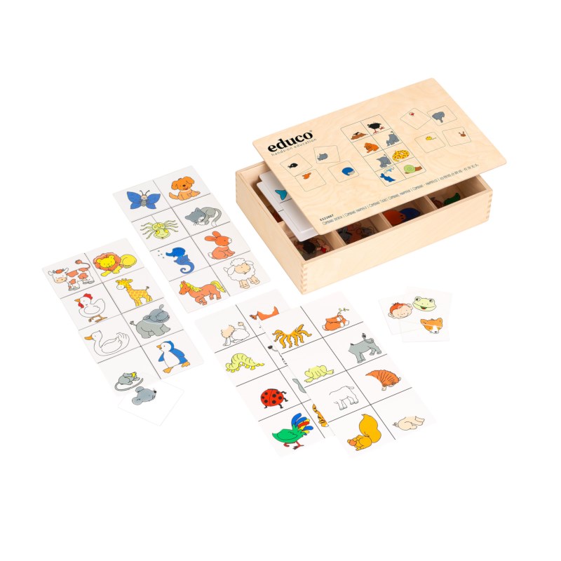 Combino - dieren laat zien hoe visuele kenmerken samenhangen. Door incomplete afbeeldingen aan te vullen met transparante beeldkaarten, groeit inzicht in kleur, vorm en detail. Dit stimuleert visuele analyse en ondersteunt taalontwikkeling. Kinderen breiden hun woordenschat uit door beeldkaarten aan de juiste opdrachtkaarten te koppelen en leren relaties tussen kenmerken begrijpen.