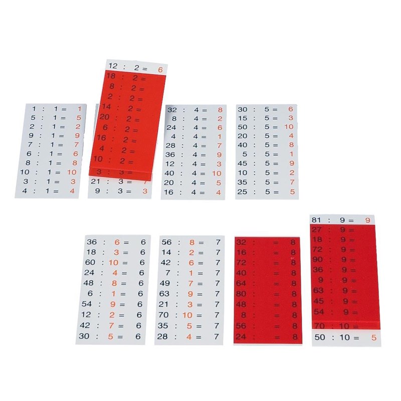 Set van 10 oefenkaarten voor het oefenen van de deeltafels.