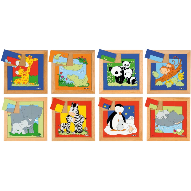 Complete set van acht puzzels over moederdieren en hun jongen. Ontdek hoe de verschillende diersoorten eruitzien.