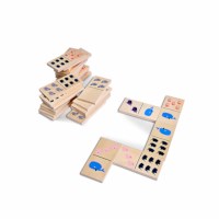 Het klassieke dominospel, maar dan in grote uitvoering met vrolijke dieren. Omdat de cijfers worden ondersteund door kleuren en afbeeldingen, is Dikke dieren domino is ook geschikt voor de jongere spelers. Elke speler neemt 4 stenen en de rest gaat in de pot. Leg een beginsteen neer. Om de beurt mag je nu een steen aanleggen. Als je niet kunt dan pak je van de pot. Wie als eerste zijn stenen kwijt is heeft gewonnen. Bevordert logisch inzicht en behendigheid.