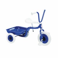 Blauwe stevige Winther driewieler, voorzien van kiep- en laadbakje, verstelbaar zadel en volrubber banden.