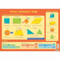 Op een overzichtelijke en kleurrijke manier wordt de belangrijkste leerstof van omtrek, oppervlakte en volume getoond. Formaat 30,5 x 43 cm (l x b).