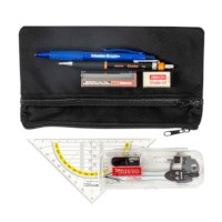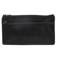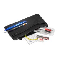 Zwart etui met 2 vakken en 2 ritsen, gevuld met de basisbenodigdheden.