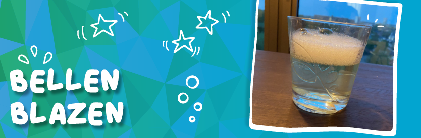 Vul het glas met water. Pak vervolgens het rietje en blaas door het rietje heen tot je bubbels ziet. Wat valt je op? Waar gaan deze bellen naartoe? Voeg vervolgens zeep aan het water toe en herhaal het blazen van de bellen. Wat valt je nu op?