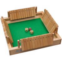 Inhoud: een bordspel met dobbelstenen, twee gewone en een 12-kantige met de getallen 1 t/m 12. Het speelveld is bekleed met groen vilt.