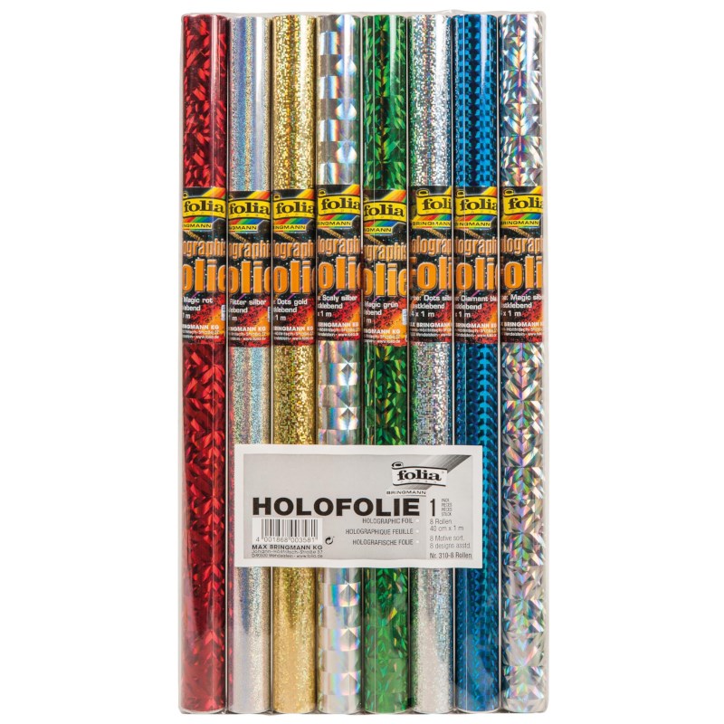 Assortiment van 8 rollen, zelfklevend holografisch folie. Formaat: 40 x 100 cm.