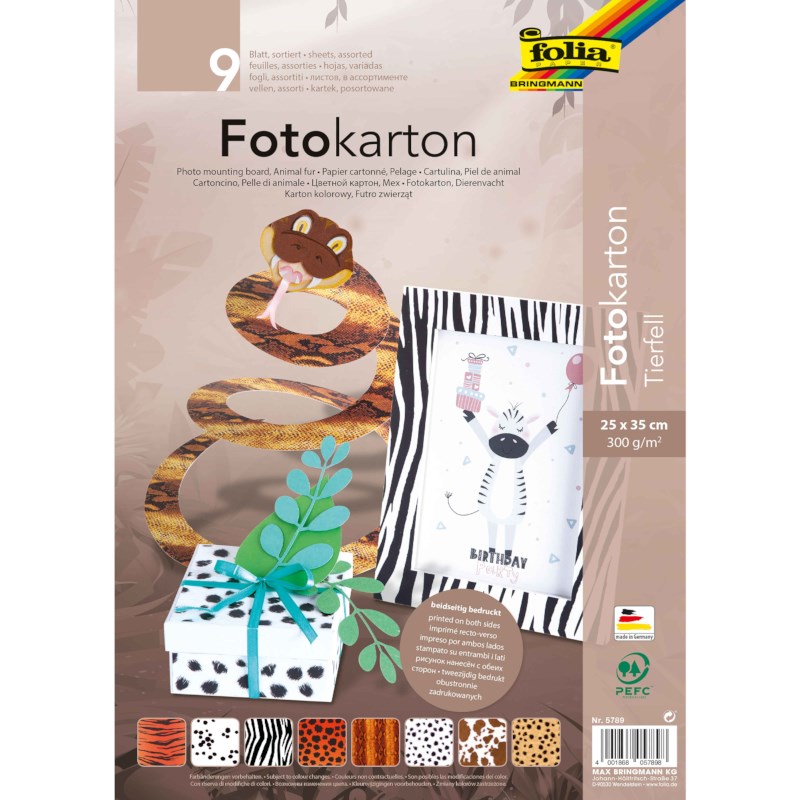 Gekleurd karton, pak met 9 bedrukte vellen met een dierenprint.