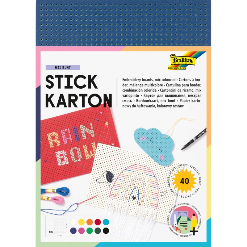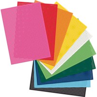 Een assortiment van 10 kleuren gaatjeskarton. Het karton is 250 gram dik. De gaatjes in het karton hebben een gatgrootte van 2 mm. 250 grams karton met 2 mm gaten. 10 kleuren assorti. In het pak zit 40 vel met een formaat van 17,5 x 24,5 cm. Met borduurnaalden met een stompe punt kun je met dit karton leren borduren.