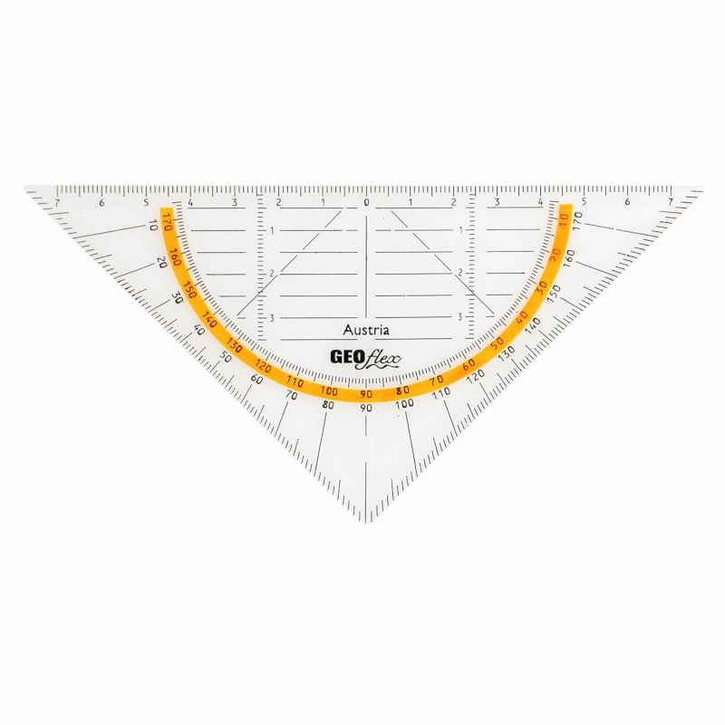 Flexibele, glasheldere geodriehoek in een plastic hoes. Door de flexibiliteit gaat de geodriehoek langer mee. Lengte: 16 cm.