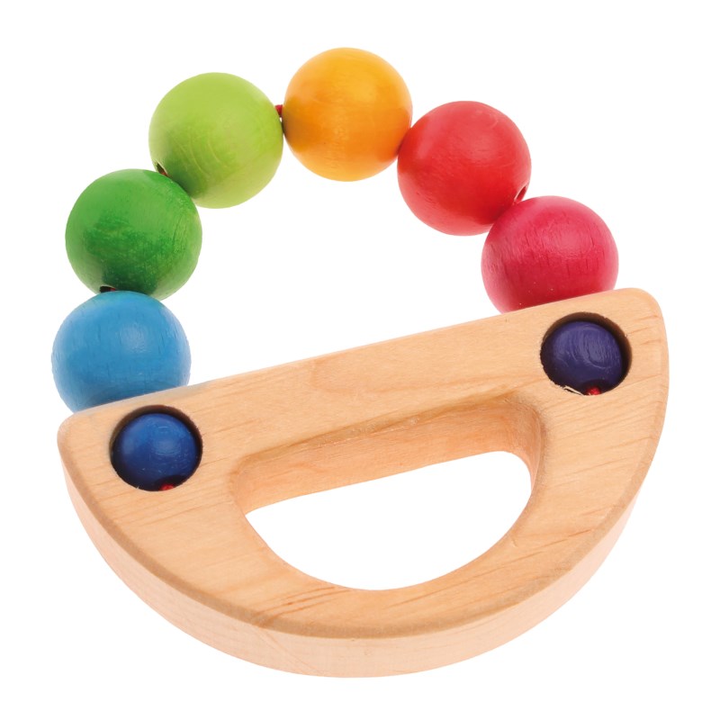 U krijgt geleverd: Een houten grijpspeeltje met kralen in regenboogkleuren.