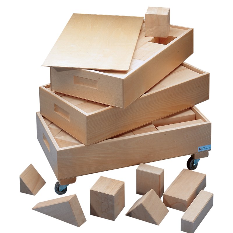 Bouwen en stapelen met de Haagse set. Opgeborgen in kisten, waarvan één verrijdbaar. Handig voor elke bouwhoek.