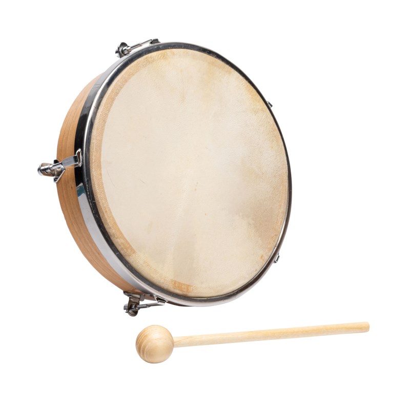 Een handtrom met vel is een rond instrument met een strak gespannen vel eroverheen. Je bespeelt het door erop te slaan met je handen of stokken. Het maakt een geluid dat je kunt veranderen door harder of zachter te slaan. Het wordt gebruikt in verschillende soorten muziek. Het is leuk om zelf te spelen en helpt je om ritme te leren!
