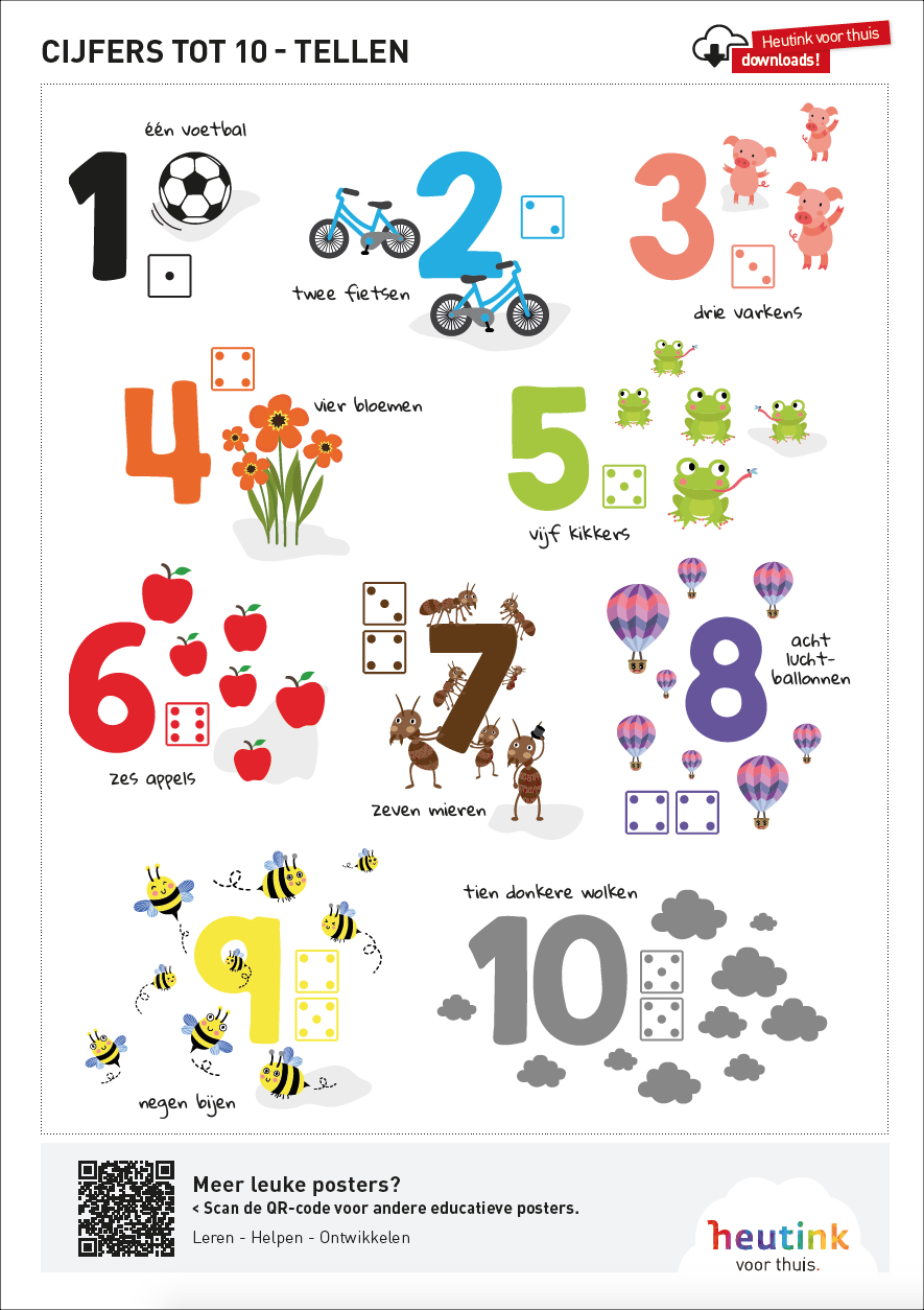Is jouw kleuter bezig met leren tellen, download dan deze vrolijke poster om de cijfers van 1 tot 10 te leren en te oefenen met tellen: