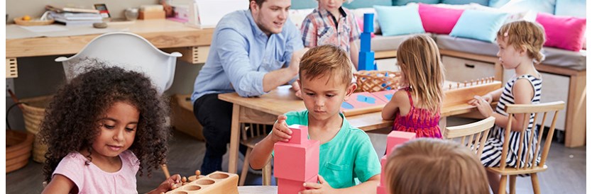 - 9.30 uur: Werken in 'hoeken' en 'groepen'. De kinderen gaan naar de tafels om een opdracht uit te voeren. Vaak is er een tekengroep, een knip- en plakgroep, een puzzelgroep en een constructiegroep. Tevens gaat er een groep in de hoeken (bouwhoek, poppenhoek, zandtafel) spelen.