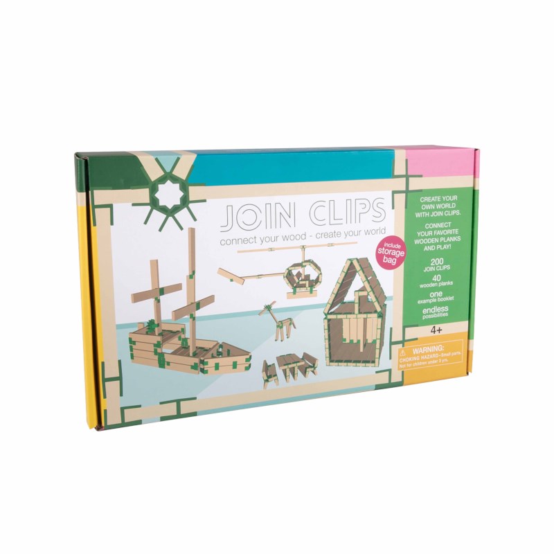 Maak kennis met JOIN CLIPS en met deze leuke mini set! Gebruik de slim gevormde verbindingselementen om de houten plankjes in vrijwel elke hoek met elkaar te verbinden. Combineer met de houten plankjes en ervaar de enorme uitbreiding van mogelijkheden. Maak vliegtuigen, boten, dieren, of popjes - je kan het allemaal maken met JOIN CLIPS! Deze JOIN CLIPS home editie bevat 200 verbinding clips in 15 diverse uitvoeringen, 40 mooi afgewerkte houten (bouw)plankjes. Een instructie boekje met 4 bouwvoorbeelden en een speel- opbergkleed. Het speelkleed is 60 cm in doorsnede en gemaakt van een nylon. Het bevat een trekkoord dat als je klaar bent met spelen je de clips en plankjes makkelijk kan opbergen door er een opbergzak van te maken.