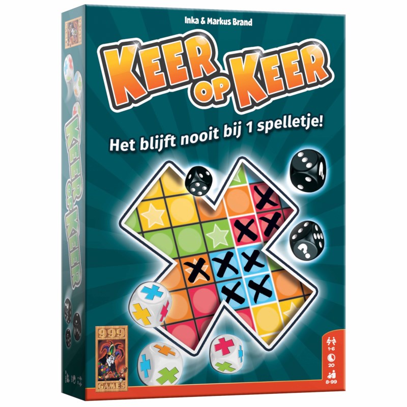 Keer op Keer is een dobbel- en puzzelspel voor het hele gezin! Kruis vakjes op je speelveld aan om zo snel mogelijk kolommen en gelijkgekleurde gebieden te vullen. Elke beurt kies je een gedobbelde kleur en een gedobbeld cijfer. Die combineer je, waardoor je aangrenzende vakjes van de gekozen kleur mag aankruisen. Maak steeds de juiste keuze en probeer de door de andere spelers gewenste combinatie weg te nemen. Je keuzemogelijkheden stijgen als je je speelveld verstandig uitbreidt. Naast punten voor complete kolommen krijg je ook een bonus als je alle vakjes van 1 kleur hebt aangekruist. Het spel is afgelopen als een speler 2 complete kleuren heeft aangekruist. Wie heeft de meeste punten?