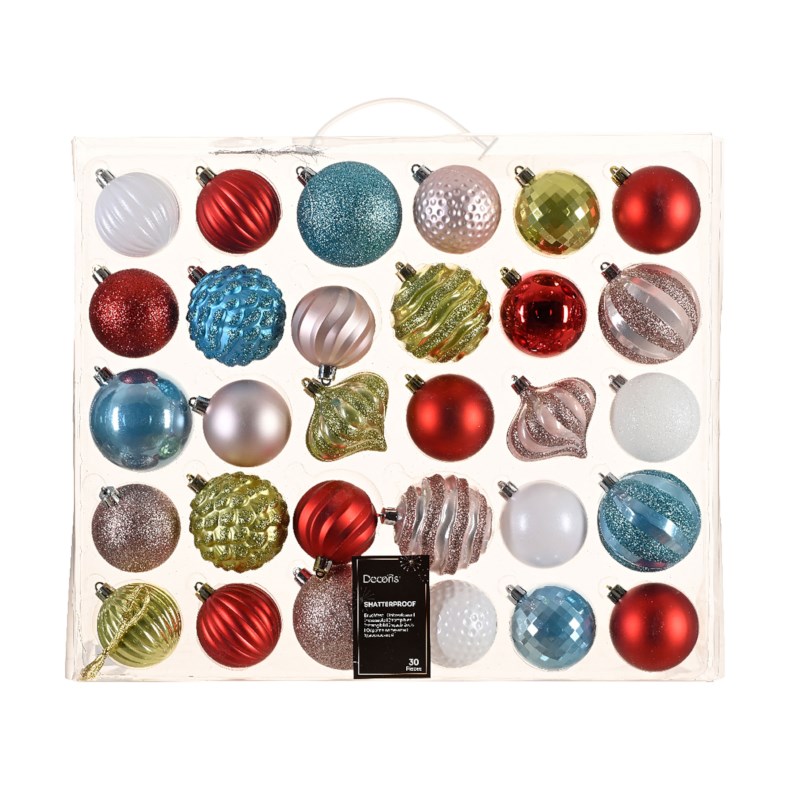 Kerstballen en vormen | Rood groen wit roze blauw | 30 stuks