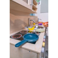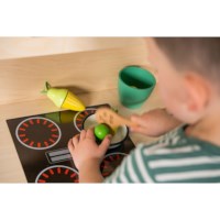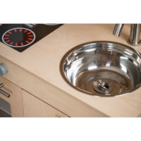inductiekookplaat, draaiknoppen, metalen kraan, spoelbak en magnetron maken het een veelzijdig meubel binnen de speelomgeving. Het blok is te gebruiken in twee hoogtes: op doppen (zonder plint) voor kinderen vanaf 2 jaar en met poten (met plint) voor kinderen vanaf 4 jaar. Zo past het in verschillende speelruimtes en groeit het mee met de gebruikers.