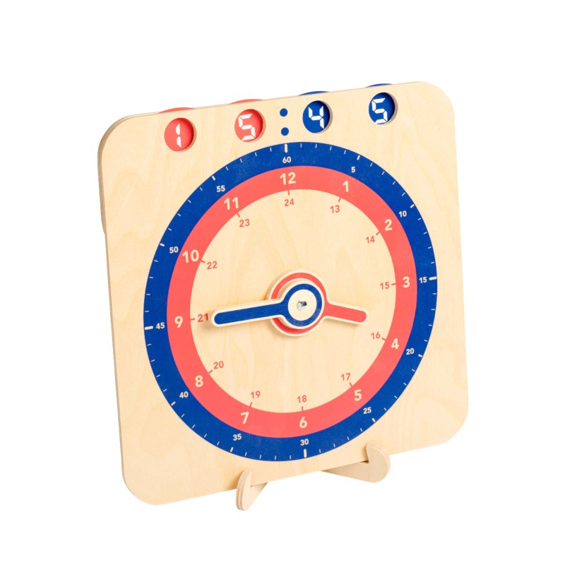 tussen beide tijdsnotaties inzichtelijk. De klok toont zowel 12- als 24-uurs tijd, waarbij de buitenring de minuten en de binnenring de uren markeert. De wijzers kunnen handmatig worden versteld, terwijl de digitale tijd kan worden ingesteld met draaibare cijfers. Dit oefenmateriaal helpt bij het leren klokkijken door middel van verschillende modellen. De klokken ondersteunen het herkennen van uren, kwartieren en minuten, het ontwikkelen van tijdsinzicht en de koppeling tussen analoge en digitale tijd. Klokbeelden bouwen stapsgewijs op, waardoor de overgang van