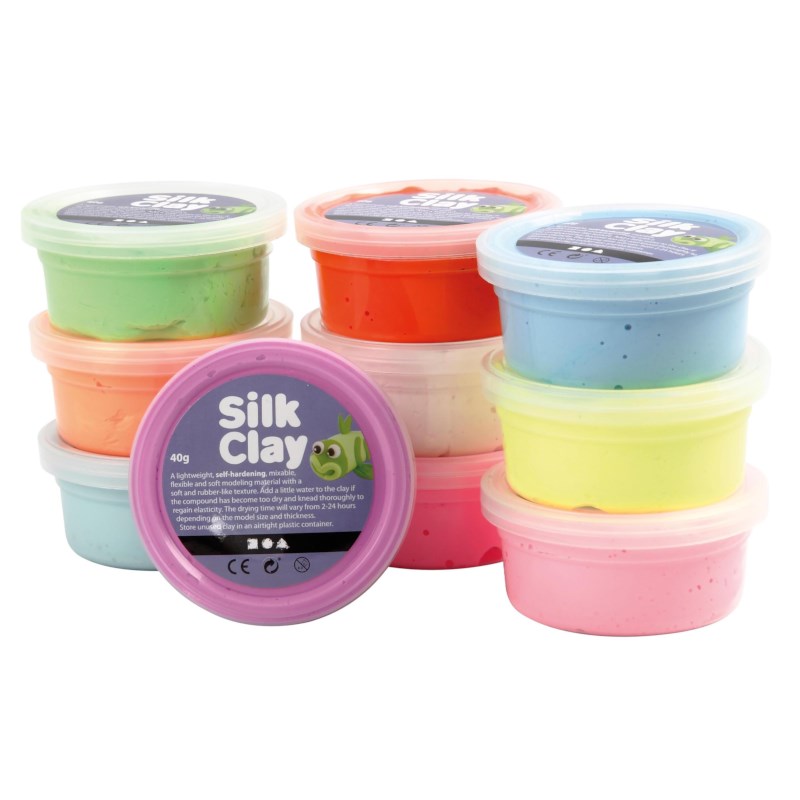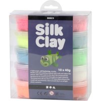 Pak à 10 dozen van elk 40 gram assorti kleuren. Zelfhardende, buigzame en lichtgewicht klei, dat een zachte en rubberachtige textuur behoudt als het droog is.