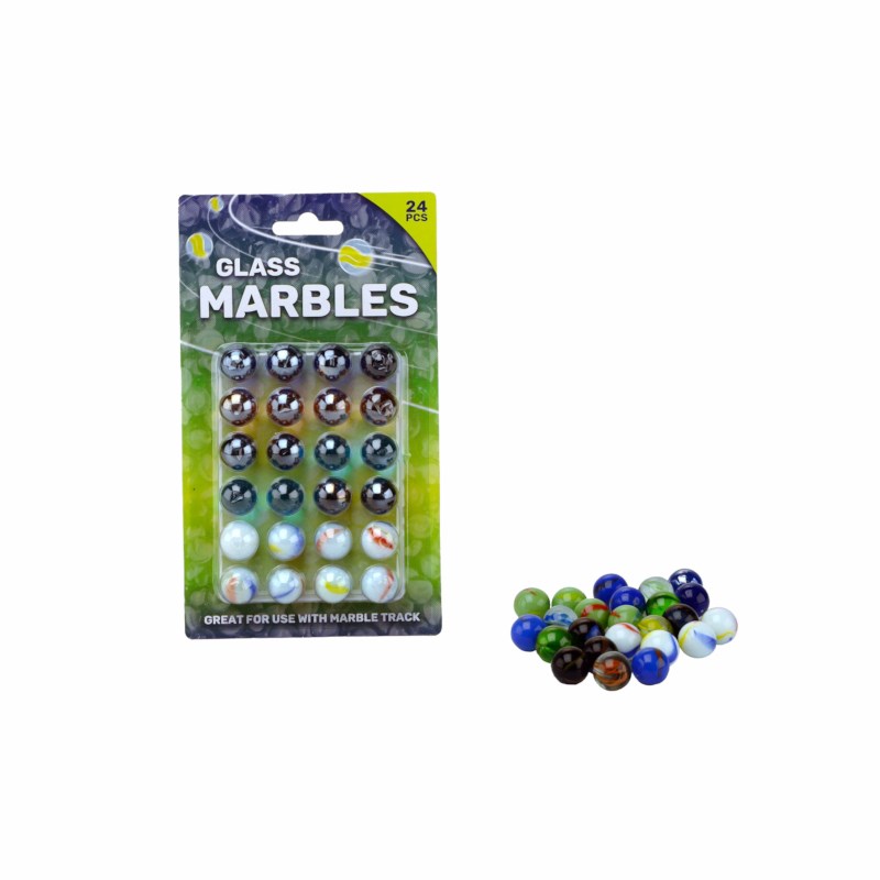 24 Glazen knikkers in verschillende kleuren en uitvoeringen. Om lekker een potje mee te knikkeren, maar ook ideaal voor gebruik op knikkerbanen.